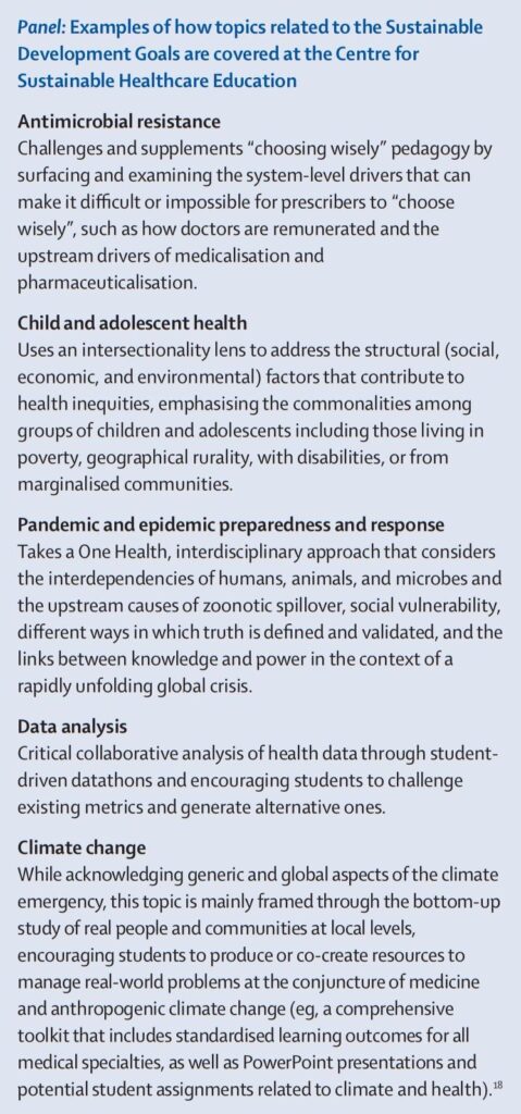 Many medical schools have started to include the UN’s 17 Sustainable Development Goals (SDGs) in their curricula. Doctors graduate knowing they shouldn’t prescribe inhalers containing greenhouse gas propellants. But they are ignorant of wider aspects of sustainability, including partnership-building, decolonization, and just transformation.